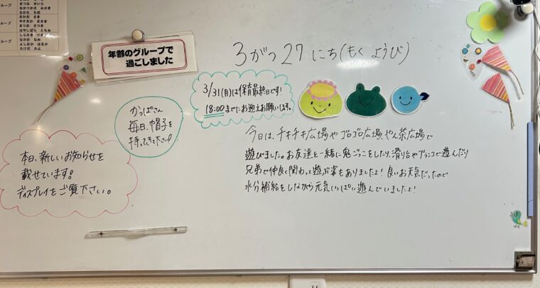 3月27日(木) 《幼児組》 かっぱさんが登場する日があと3日となりました。「あと3日しかないから、大好きなチキチキ広場で遊び 尽くすぞ~!」と、今日もたっぷり遊びました。 そしてお昼からかっぱさんは、小学校に向けて色々な歌を歌っています♪ こうやってみんなで歌って遊べる日もあと少し… 心残りがないよう、大好きな友達と明日も楽しみましょうね♡ 設定内容→(かっぱ・かえる・おたま)チキチキ広